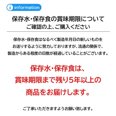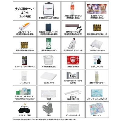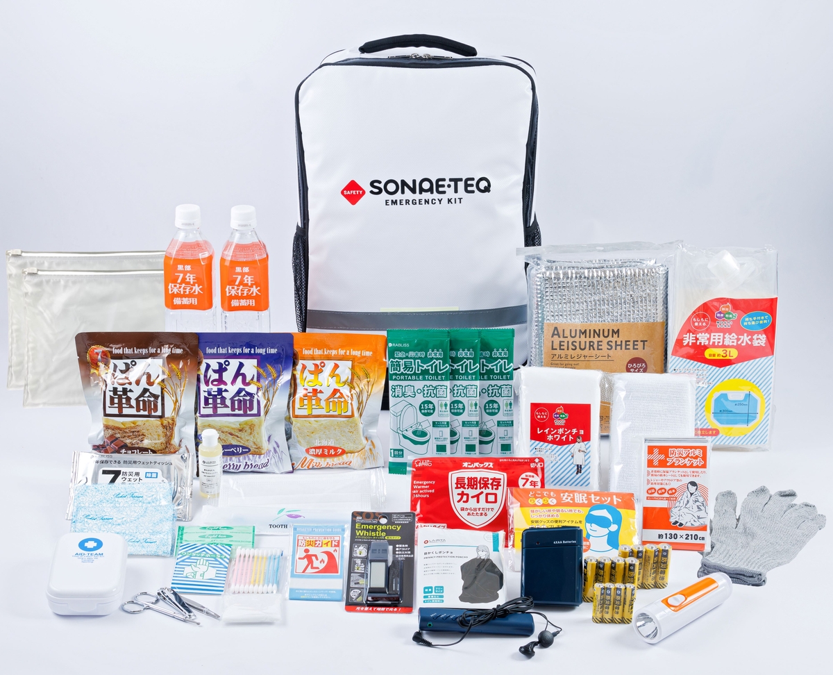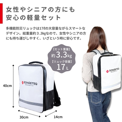 ●内容量/多機能防災リュック(約17L)×1、長期保存水(500ml)×2、長期保存パン(100g)×3、LEDハンディライト×1、乾電池式モバイルバッテリー×1、FMポケットラジオ×1、防災電池単三形(4本)×2、防災電池単四形(4本)×1、非常用簡易トイレ×3、防災アルミブランケット×1、アルミレジャーシート×1、エマージェンシーホイッスル×1、非常用給水袋(3L)×1、長期保存カイロ×1、目かくしポンチョ×1、レインポンチョ×1、フェイスタオル×1、防災用ウェットティッシュ(20枚)×1、全身ドライシャンプー×1、絆創膏(M5枚)×1、綿棒(10P)×1、コットンパフ(3枚)×1、ワンタッチホータイ×1、爪切り×1、ピンセット×1、ハサミ×1、マスク×1、歯ブラシ(歯磨き粉付き)×1、ポケットティッシュ(8W)×2、アイマスク×1、耳栓×1、軍手×1、ビニールポーチ×2、防災ガイド×1