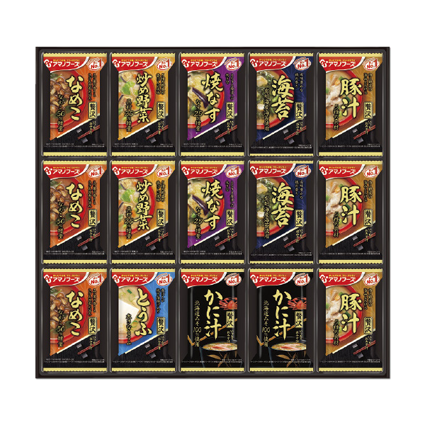 缶詰・瓶詰・汁物・レトルト 【アマノフーズ】おみそ汁贅沢セット 会員価格: (税込み) 通常価格: (税込み) 在庫: 商品コード: 25W006041 JANコード: 全国送料無料特別優待ギフト 価格 5,130円(税込み) ※掲載価格は5%割引後の価格となります。 数量 - + 販売期間外のため注文いただけません。 この商品をシェアする 販売期間 2025/11/01 10:00~2025/12/08 00:00 なめこ9g・豚汁12.5g×6食、炒め野菜11g・焼きなす 9.1g・海苔7.5g・かに汁9g×4食、とうふ10.5g×2食 常温1年 カテゴリーから選ぶ 生活雑貨 美容・健康食品 アロマ・フレグランス 紳士小物 ベビー・子ども用品 スイーツ カテゴリーから選ぶ 生活雑貨 美容・健康食品 アロマ・フレグランス 紳士小物 ベビー・子ども用品 スイーツ