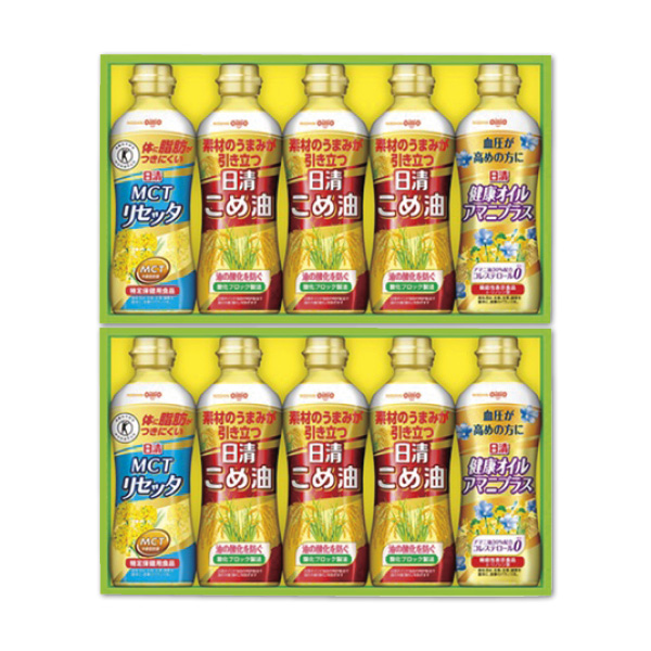 食用油・調味料 【日清オイリオ】ヘルシーオイルギフト 会員価格: (税込み) 通常価格: (税込み) 在庫: 商品コード: 25W008044 JANコード: 全国送料無料特別優待ギフト 価格 5,130円(税込み) ※掲載価格は5%割引後の価格となります。 数量 - + 販売期間外のため注文いただけません。 この商品をシェアする 販売期間 2025/11/01 10:00~2025/12/08 00:00 MCTリセッタ350gPET×2、健康オイルアマニプラス350gPET×2、こめ油350gPET×6 常温2年1ヶ月 カテゴリーから選ぶ 生活雑貨 美容・健康食品 アロマ・フレグランス 紳士小物 ベビー・子ども用品 スイーツ カテゴリーから選ぶ 生活雑貨 美容・健康食品 アロマ・フレグランス 紳士小物 ベビー・子ども用品 スイーツ