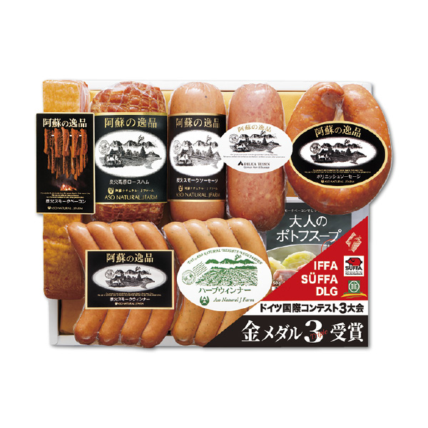 ハム・ミートギフト 【阿蘇の逸品】手造りハム・ソーセージ 会員価格: (税込み) 通常価格: (税込み) 在庫: 商品コード: 25W086096 JANコード: 価格 10,260円(税込み) ※掲載価格は5%割引後の価格となります。 数量 - + 販売期間外のため注文いただけません。 この商品をシェアする 販売期間 2025/11/01 10:00~2025/12/08 00:00 炭火スモーク(ベーコン、ロースハム、ソーセージ、ウインナー)・ゲッティンガー・ポリニッシュソーセージ・ハーブウインナー・ポトフスープ 冷蔵30日 カテゴリーから選ぶ 生活雑貨 美容・健康食品 アロマ・フレグランス 紳士小物 ベビー・子ども用品 スイーツ カテゴリーから選ぶ 生活雑貨 美容・健康食品 アロマ・フレグランス 紳士小物 ベビー・子ども用品 スイーツ