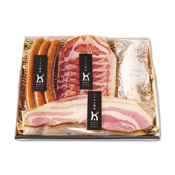 ハム・ミートギフト 【唐津くん煙工房 佐賀県】おうちでバルセット 会員価格: (税込み) 通常価格: (税込み) 在庫: 商品コード: 25W088056 JANコード: メーカー直送 送料込みギフト 価格 4,104円(税込み) ※掲載価格は5%割引後の価格となります。 数量 - + 販売期間外のため注文いただけません。 この商品をシェアする 販売期間 2025/11/01 10:00~2025/12/08 00:00 粉雪サラミ45g、乾塩仕込み生ハムコッパ25g、あらびきウインナー93g、燻しベーコンステーキ45g 冷凍90日 カテゴリーから選ぶ 生活雑貨 美容・健康食品 アロマ・フレグランス 紳士小物 ベビー・子ども用品 スイーツ カテゴリーから選ぶ 生活雑貨 美容・健康食品 アロマ・フレグランス 紳士小物 ベビー・子ども用品 スイーツ
