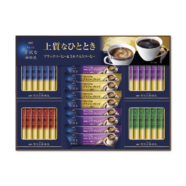 コーヒー・紅茶・銘茶 【AGF】スティックアソートギフト 会員価格: (税込み) 通常価格: (税込み) 在庫: 商品コード: 25W112101 JANコード: 価格 3,078円(税込み) ※掲載価格は5%割引後の価格となります。 数量 - + 販売期間外のため注文いただけません。 この商品をシェアする 販売期間 2025/11/01 10:00~2025/12/08 00:00 ブラジルブレンド、コロンビアブレンド、キリマンジャロブレンド、モカブレンド×各7、プレミアム(ブラジルB、コロンビアB)×各6 常温2年1ヶ月 カテゴリーから選ぶ 生活雑貨 美容・健康食品 アロマ・フレグランス 紳士小物 ベビー・子ども用品 スイーツ カテゴリーから選ぶ 生活雑貨 美容・健康食品 アロマ・フレグランス 紳士小物 ベビー・子ども用品 スイーツ