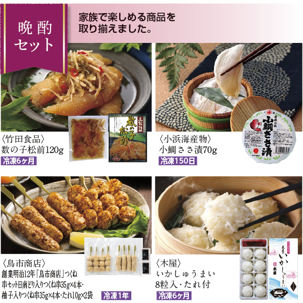 ■ 浜屋のお歳暮2025(11/1 10:00~) 【冬のチョイスギフト4点セット】晩酌セット 会員価格: (税込み) 通常価格: (税込み) 在庫: 商品コード: 25W135062 JANコード: メーカー直送 送料込みギフト 価格 5,643円(税込み) ※掲載価格は5%割引後の価格となります。 数量 - + 販売期間外のため注文いただけません。 この商品をシェアする 販売期間 2025/11/01 10:00~2025/12/08 00:00 <竹田食品>数の子松前120g 冷凍6ヶ月、<小浜海産物>小鯛ささ漬70g 冷凍150日、<鳥市商店>創業明治12年「鳥市商店」つくね串セット(日南どり入りつくね串35g×4本・柚子入りつくね串35g×4本・たれ10g×2袋) 冷凍1年、<木屋>いかしゅうまい8粒入・たれ付 冷凍6ヶ月 カテゴリーから選ぶ 生活雑貨 美容・健康食品 アロマ・フレグランス 紳士小物 ベビー・子ども用品 スイーツ カテゴリーから選ぶ 生活雑貨 美容・健康食品 アロマ・フレグランス 紳士小物 ベビー・子ども用品 スイーツ